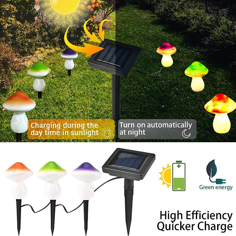 The mushroom light is powered by solar panel, which is eco-friendly and economic.Just turn on the switch, it will automatically turn on the light at night.
